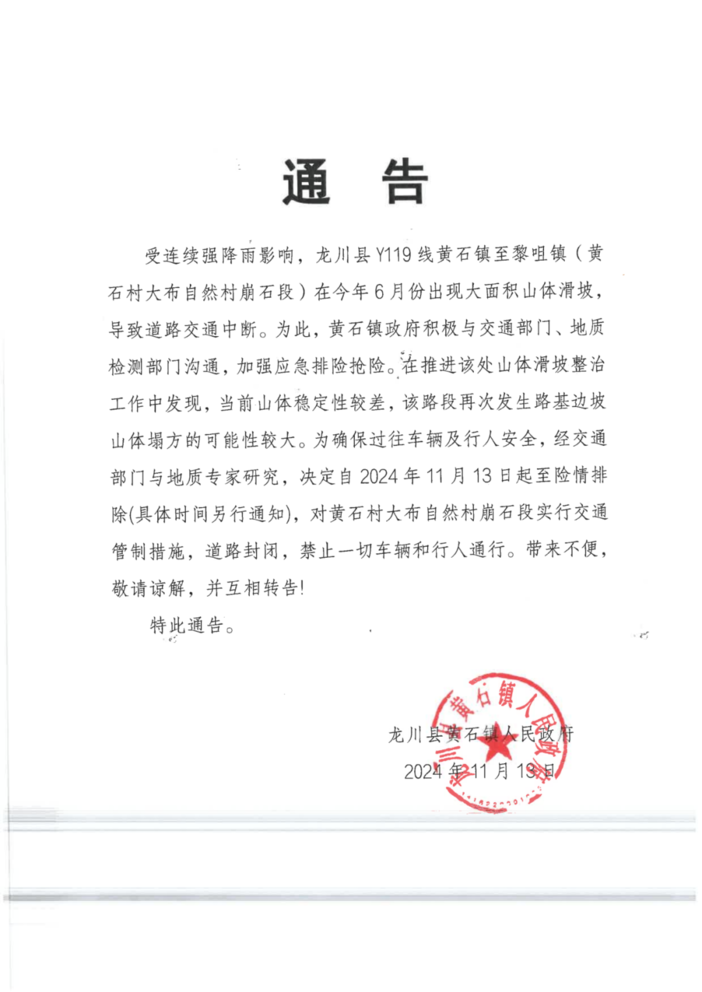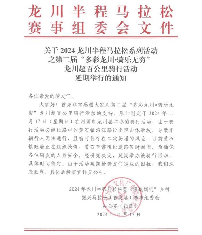 大家好!首先非常感谢大家对2024第二届龙川超百公里骑行活动的支持。原计划定于2024年11月17日(星期日)在河源市龙川县举办的2024年第二届‘多彩龙川·骑乐无穷’龙川超百公里骑行活动,由于骑行活动必经线路中的黄石镇沿江路段有突发山体滑坡,导致车辆行人无法通行,且有可能存在二次坍塌,目前黄石镇政府正在组织抢修,黄石至黎咀段道路暂时封闭。为确保各位骑友的人身安全,经研究决定, 延期举办该骑行活动,具体时间待定 ,由于活动延期给骑友们造成的困扰,我们深表歉意!